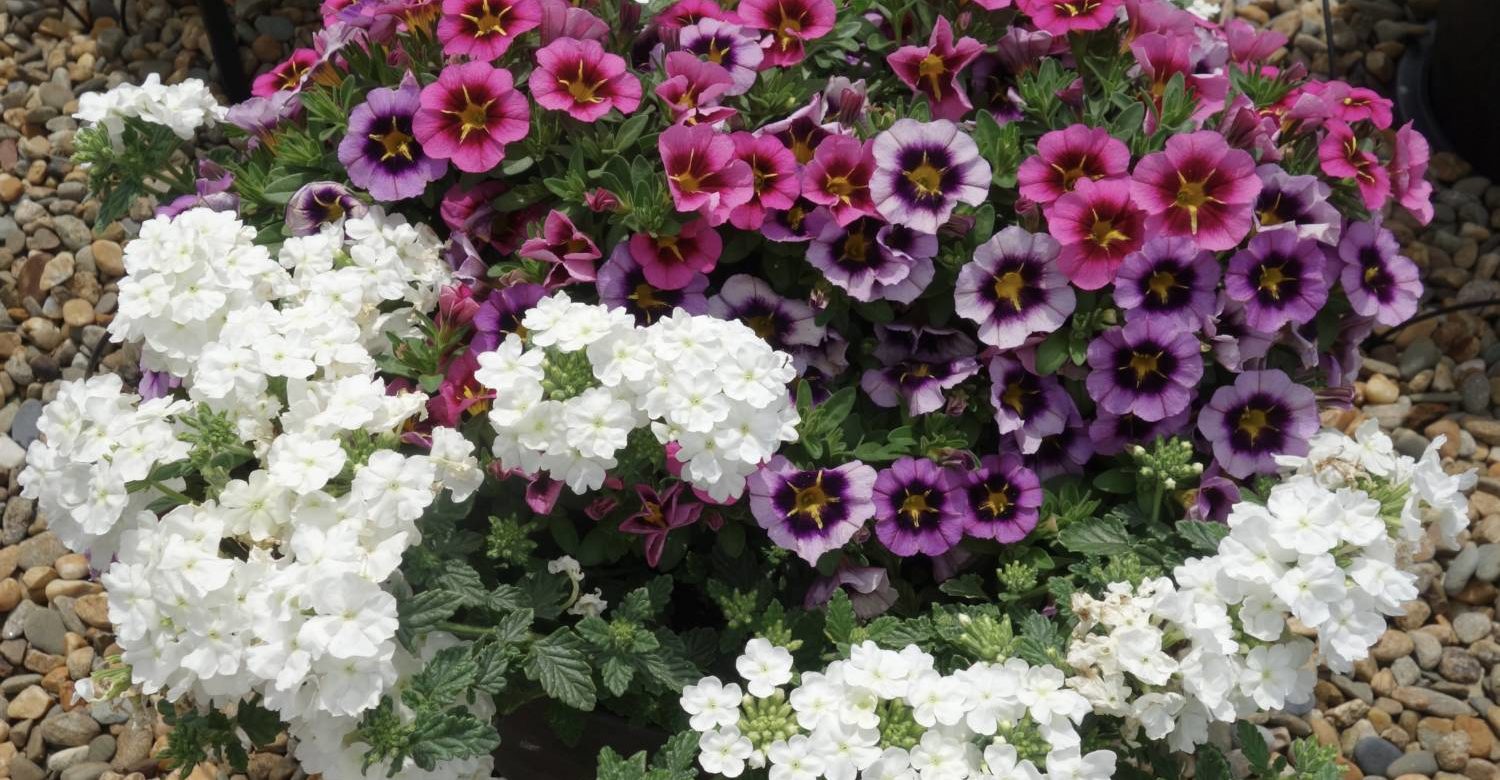 This new Confetti Garden trio mix was striking, vivid and reflected texture, balance, component timing and captivating flower colors. This recipe combines petunia ‘Surprise Raspberry Jam’, a new variety for 2022, calibrachoa ‘Aloha Kona White’ and verbena ‘Empress Flair Burgundy’. The different hues of ‘Raspberry Jam’, the high saturation and richness of ‘Empress Flair Burgundy’, and highly reflective ‘Aloha Kona White’ attracted my attention. The three flower classes in this confetti garden are consequential and notable in the Dümmen Orange annual program and are utilized in many of the Confetti Garden recipes, quarts, baskets and combinations in spring programs.