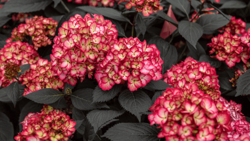 The Eclipse story begins in Georgia, at Bailey Innovations, the breeding arm of Bailey Nurseries. In 2017, David Roberts, director of plant breeding, took two hybridized plants from Hydrangea macropylla and planted the seeds to look for unique characteristics. After observing dark foliage on the seedlings, Roberts and his team continued evaluating the plants to observe their characteristics. In summer of 2018, the seedlings began to stand out as the foliage remained dark all summer.