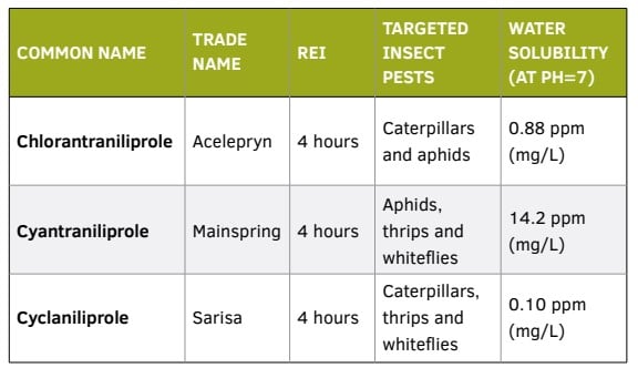 Table 1. Common name (active ingredient), trade name, restricted entry interval (REI), targeted insect pests (based on label information) and water solubility of Insecticide Resistance Action Committee (IRAC) group 28 insecticides.