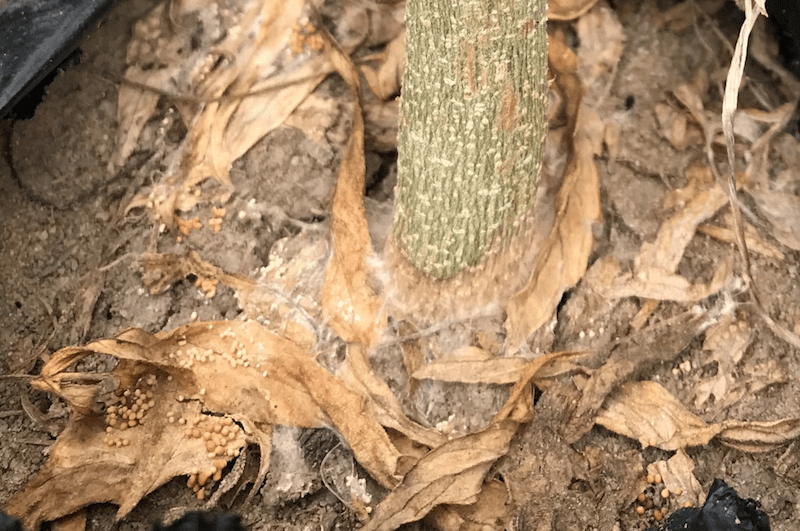 Early symptoms progress quickly from the base of the plant up the stem and to the leaves. As disease progression advances, a white, moldy fungal growth (pictured above) will be visible around the base of the plant with characteristic white or tan round bodies as seen in the images below. As the disease moves rapidly, plant death occurs quickly after observation of first symptoms. Dead, upright plants with leaves still attached will be common in a hemp field suffering from an outbreak of Southern Blight.Prevention