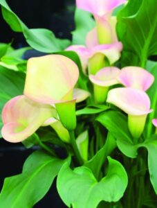 An experimental variety at last year’s trials, ‘Peach Pazazz’ has more of a bouquet effect with its spreading foliage. This new calla is versatile and can be used in the landscape or in containers.