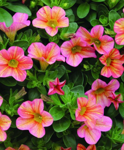 bears a stable color pattern with orange, pink and coral tones. It has increased flower coverage and larger blooms that will look great in hanging baskets or combinations.