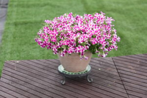 Suntory has had great success with its ‘Surfinia Heartbeat’ and is adding a new color, ‘Surfinia Purple Heart’. Each white flower features a pattern of five purple hearts. It provides a charming presentation in baskets and containers, and is perfect for spring and summer holiday promotions.