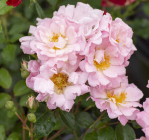 ‘Blushing Drift’ displays attractive, double, pink flower clusters with a warm yellow center. Its compact size, disease resistance and heavy blooming make it a stunning and reliable landscape choice.