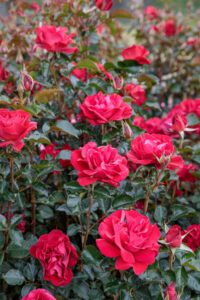 ‘Ruby Red’ is a compact rose that blooms heavily. The flower color is dark red and non-fading against dark green, glossy foliage. It stands out beautifully in the garden and makes an excellent container presentation.