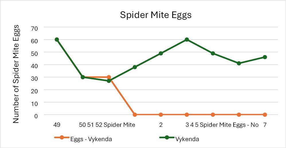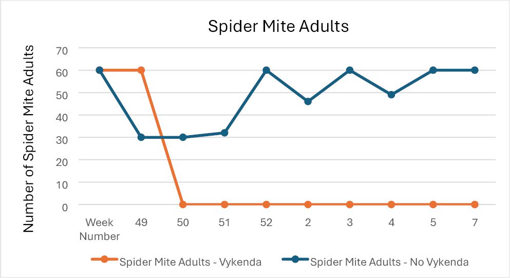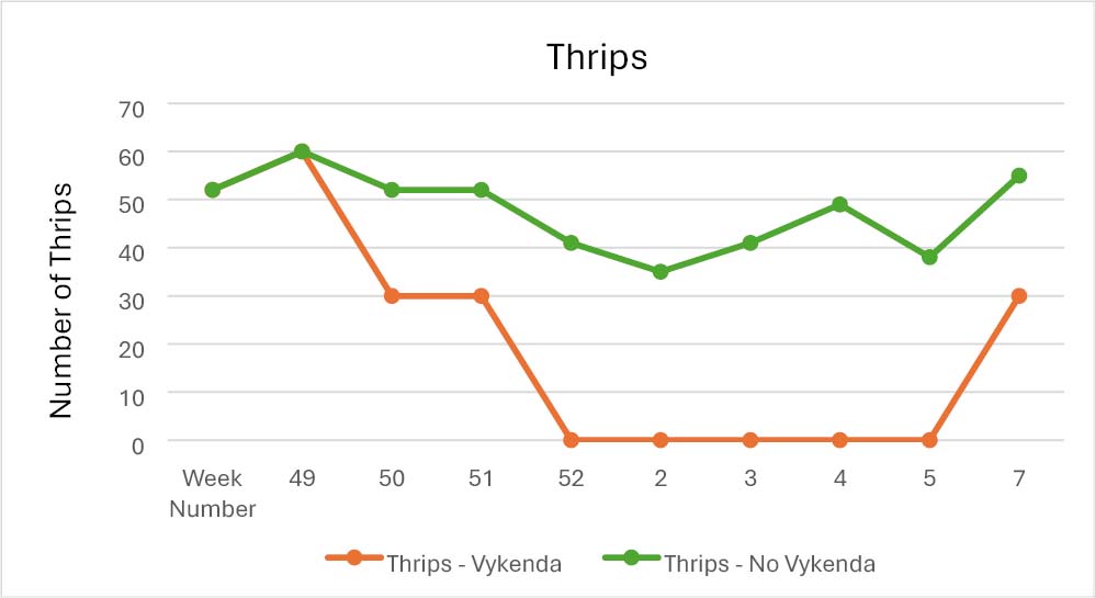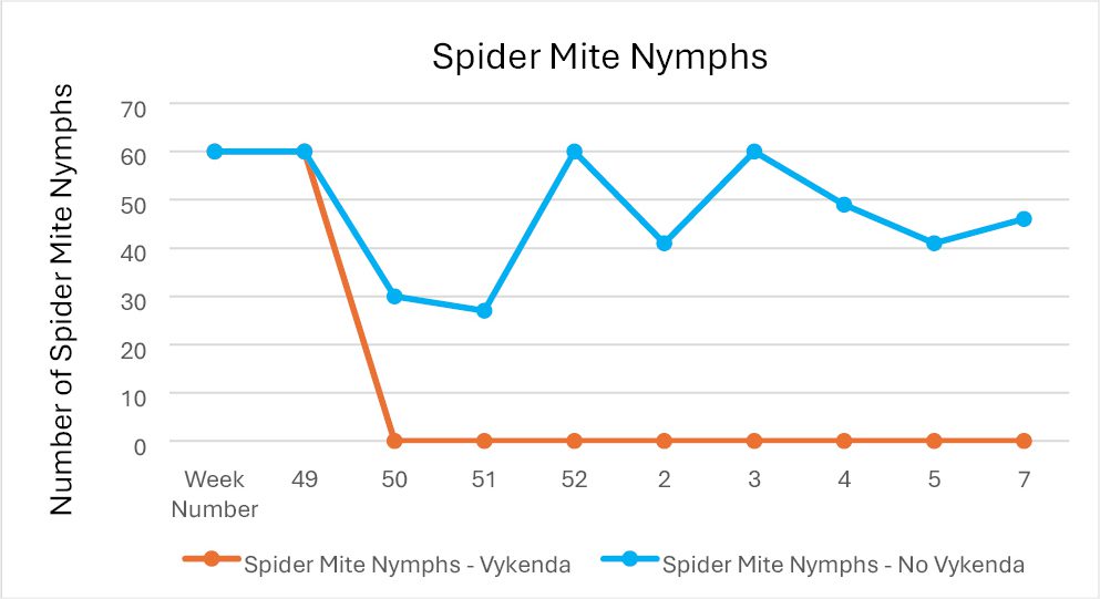 According to trial observations, a single application of Vykenda at 5 fluid ounces per 100 gallons reduced populations of pepper thrips and two-spotted spider mites to zero within one week in cat palm plantings. Scouting reports indicated treated plants remained free of the pests for more than 12 weeks.